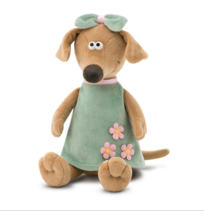 Собака Жужа ростом 30см, одета в сарафан цвета мяты с милыми розовыми цветами. На голове у Жужы - стильный бант в тон платья. Игрушка изготовлена из гипоаллергенных материалов: искусственный мех, полиэстер, пластик, текстиль; Размер упаковки - 23 х 12 х 12 см.