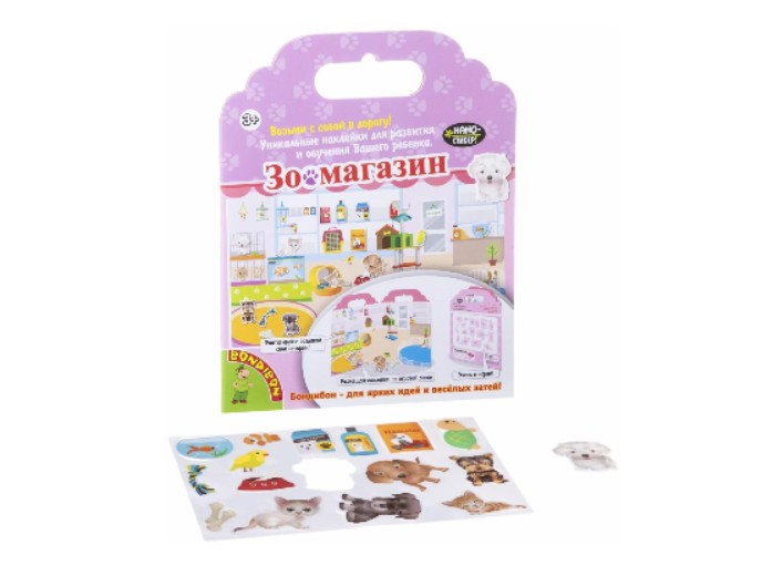 Благодаря прочным, легко снимающимся нано-стикерам и яркому дизайну набор идеально подходит для домашней игры, занятий в дороге, развлечения в ожидании и творческих занятий в детском саду. "Зоомагазин" превращает игру с наклейками в увлекательный интерактивный мир, где каждый ребенок может создавать свои собственные события.