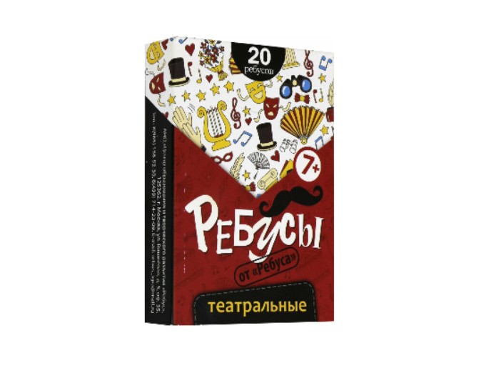 Ребусы театральные — настольная игра-головоломка, созданная для детей от 7 лет и старше, а также для семейного досуга, школьных занятий и творческих групп. Она помогает в игровой форме развивать внимание, логическое и ассоциативное мышление, кругозор и интерес к театральному искусству.