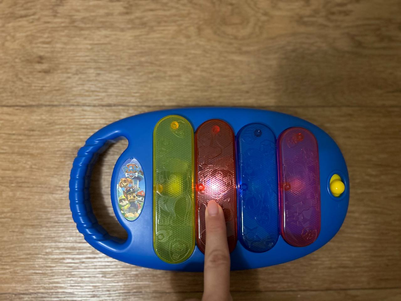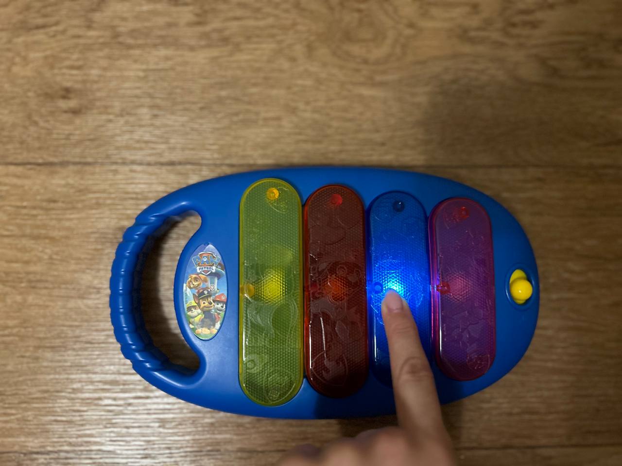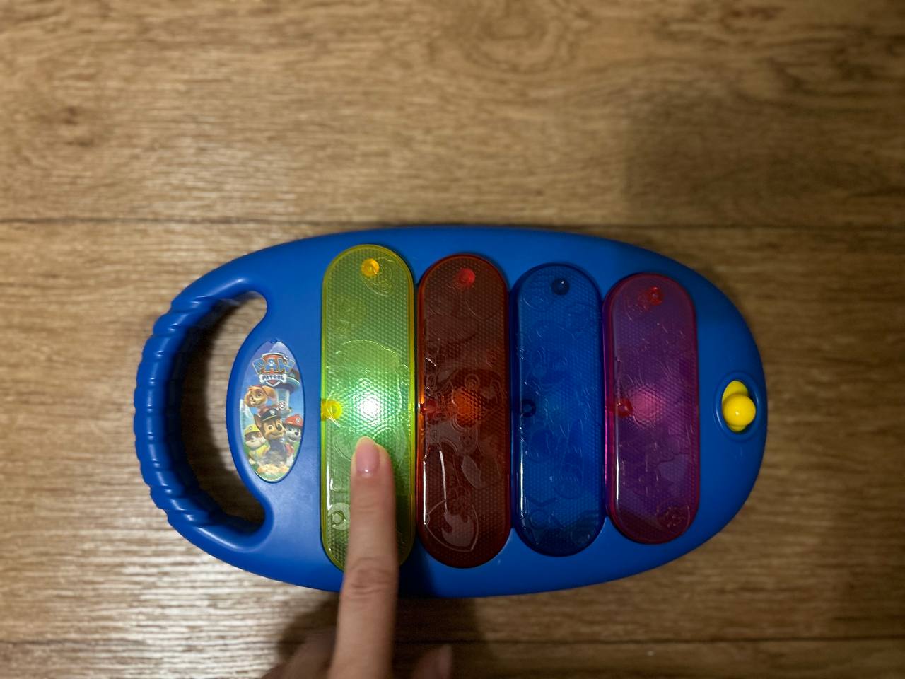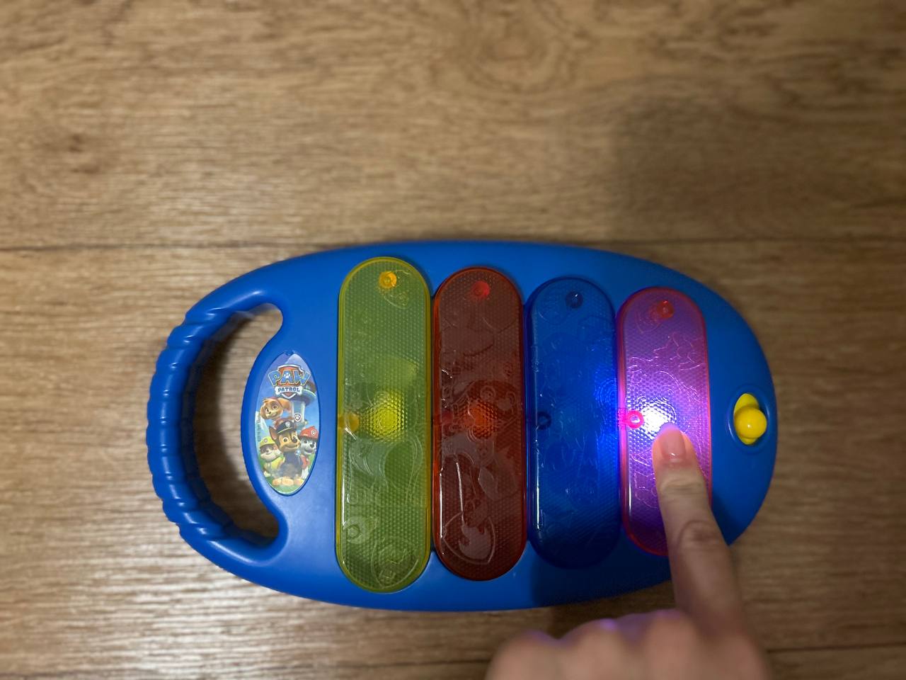 Мы с мужем растим музыканта! Так явно думают наши соседи, потому что последние несколько дней до них явно доносятся звуки, издаваемые новой игрушкой. Она представляет собой пластиковый инструмент синего цвета с ручкой для удобной переноски. На нем четыре клавиши и выпуклыми изображениями персонажей мультика щенячий патруль. И есть две кнопки (спереди и сзади), которые переключают режимы.